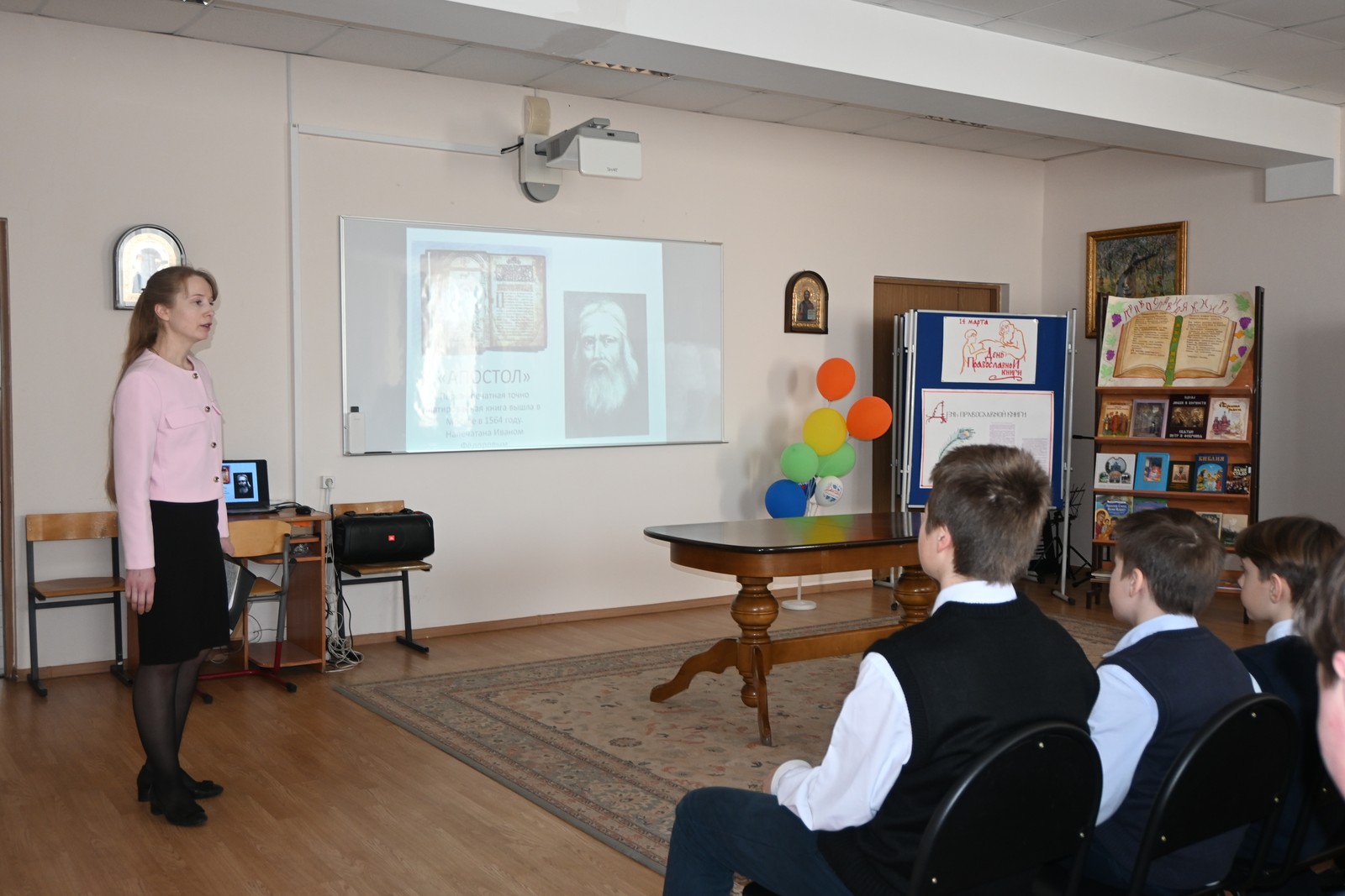 17 марта 2026 года прошёл классный час, посвященный Дню православной книги в 5-9 классах. В ходе мероприятия ребята вспомнили о первопечатнике Иване Фёдорове и первой печатной книге-Апостол. Посмотрели подборку книг православной литературы, которые можно взять в библиотеке школы. Ребята читали стихи и узнавали тайны, скрытые в русских словах.