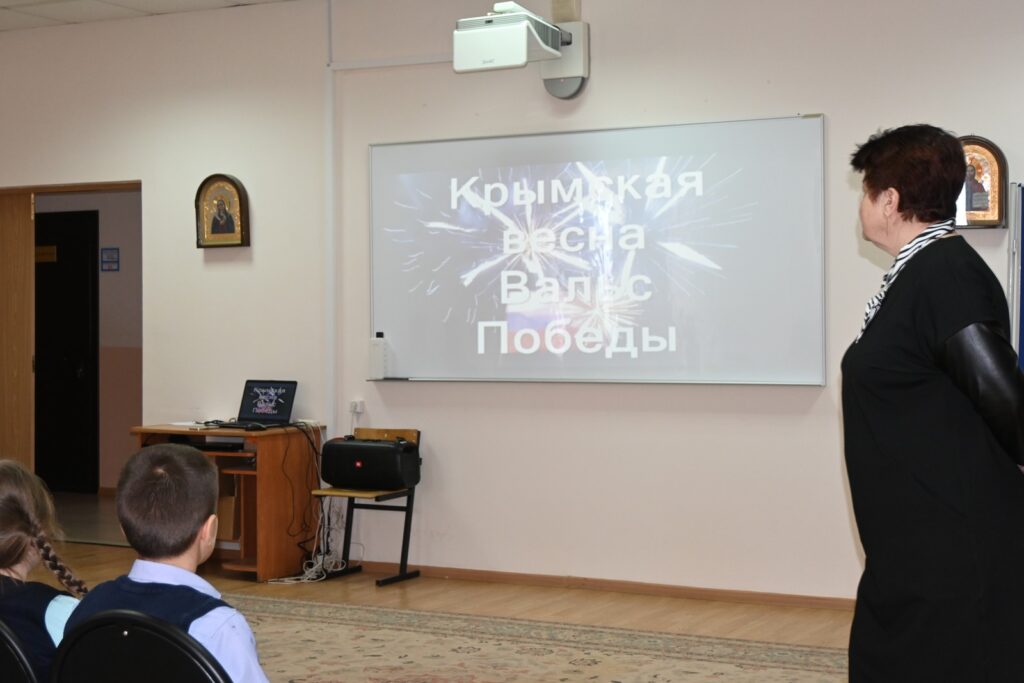 Наша школа тоже отпраздновала это историческое событие. Обучающиеся с 1 по 9 классы собрались вместе и окунулись в исторические события, связанные с судьбой полуострова Крым.