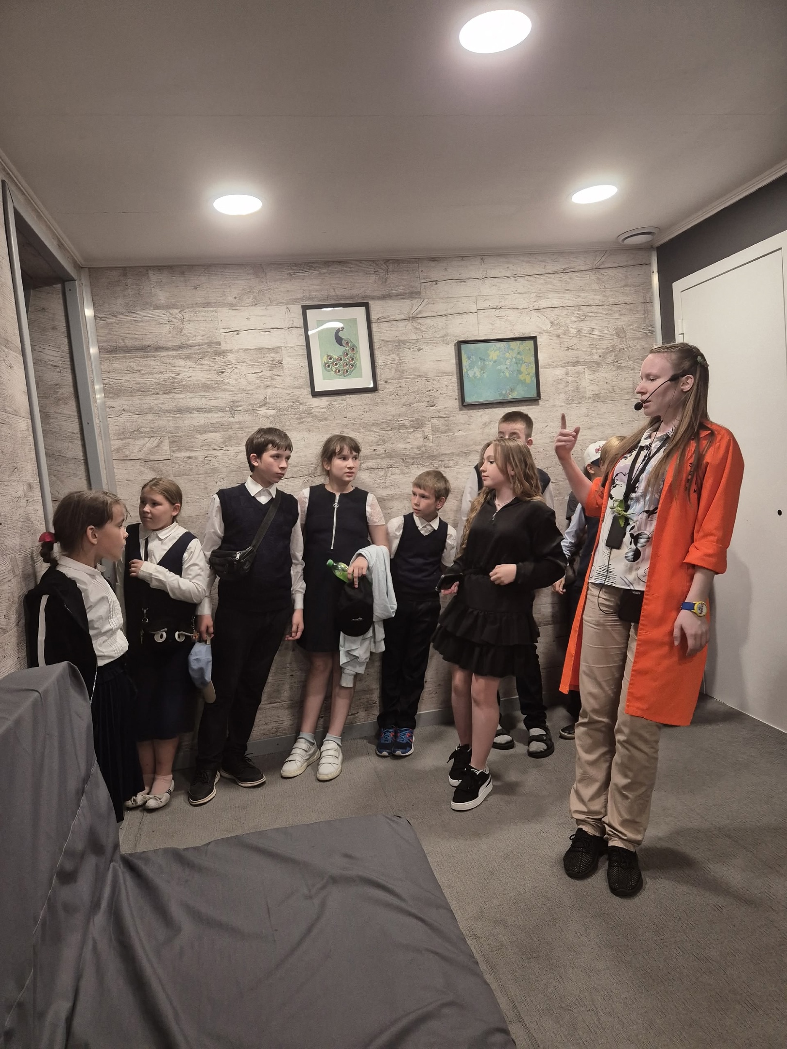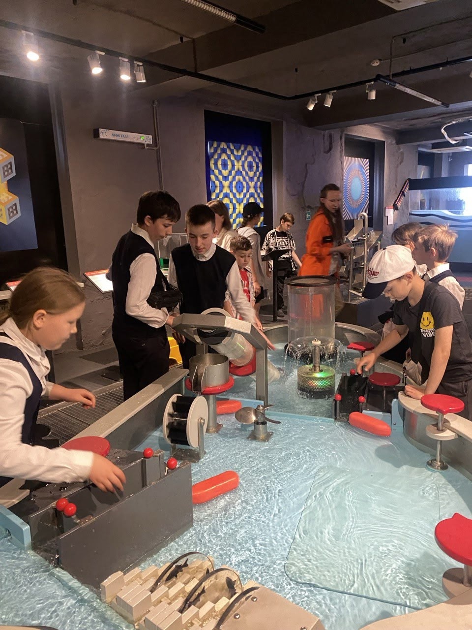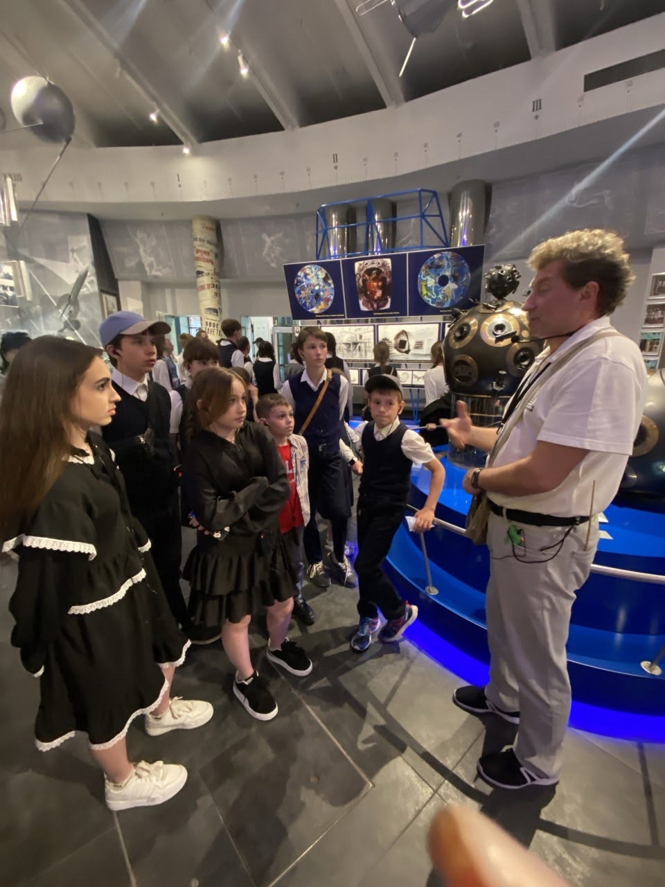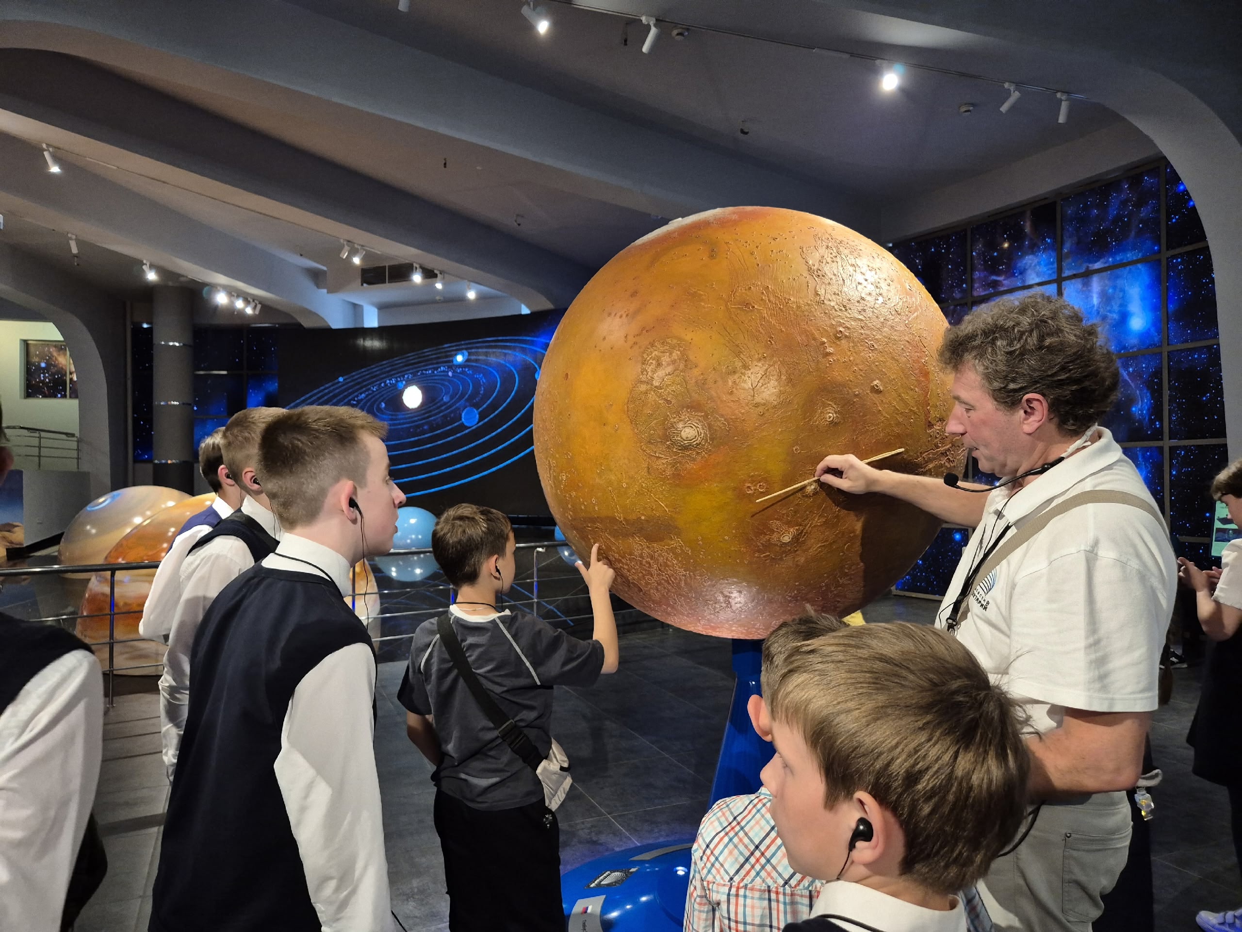 Далее школьники отправились в Московский планетарий на экскурсию по музею Урании. Здесь дети познакомились с историей планетария, узнали о принципах его работы, посмотрели витрины с телескопами, солнечными часами и другими инструментами, полюбовались звёздным небом и планетами Солнечной системы.