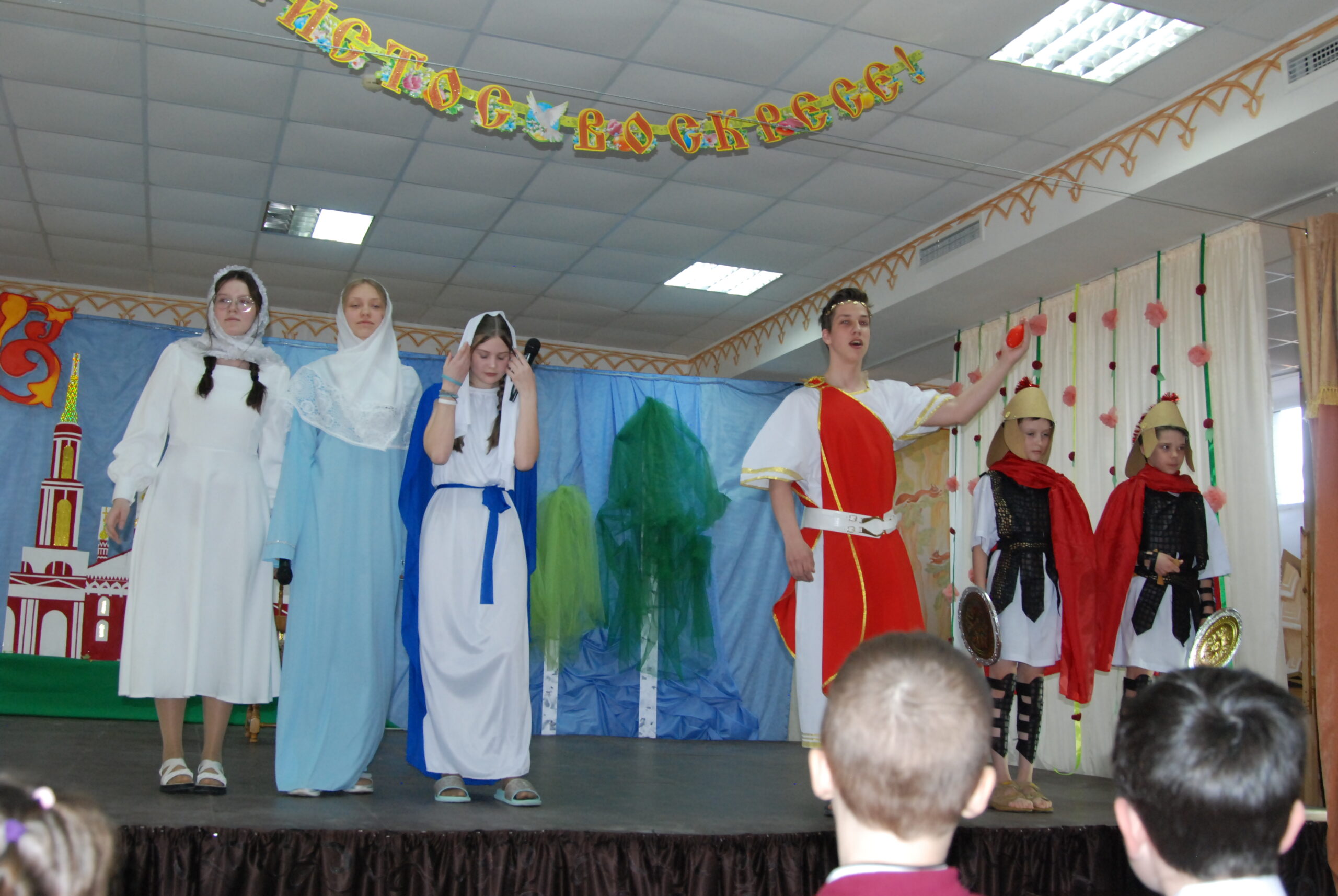 Христос Воскресе! Празднование Светлого Праздника Пасхи началось в храме Архангела Михаила: Крестный ход, Литургия, Причастие, освящение куличей и яиц. После небольшого отдыха праздник продолжился в стенах школы. Для всех присутствующих была представлена концертная программа. Выступили вокальный и фольклорный ансамбли, школьный театр «Росток». В прекрасном настроении все разошлись на Пасхальные каникулы.