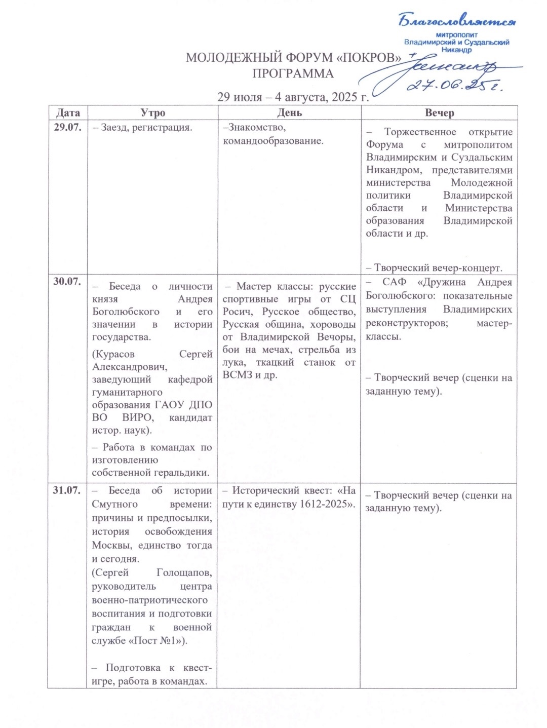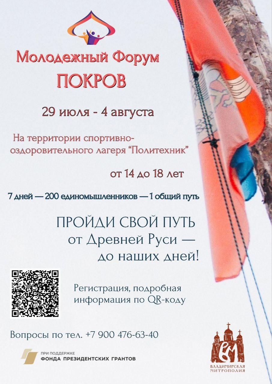 По благословению Высокопреосвященнейшего Никандра, митрополита Владимирского и Суздальского, *с 29 июля по 4 августа 2025 года* на базе спортивно-оздоровительного лагеря «Политехник» (Камешковский район) будет проходить молодежный Форум «ПОКРОВ».